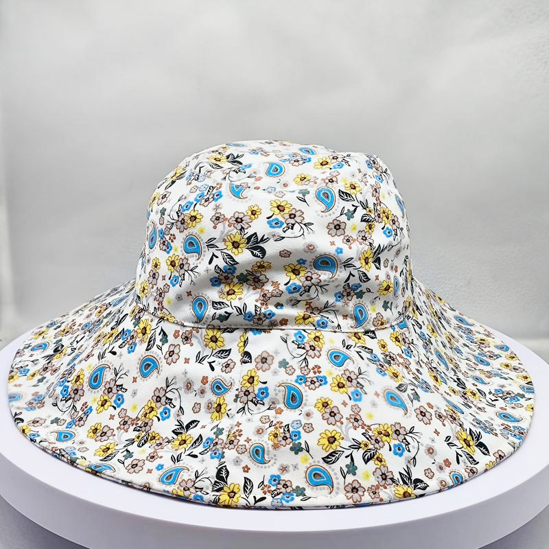 Style: wide-brimmed floral heat transfer print bucket hat