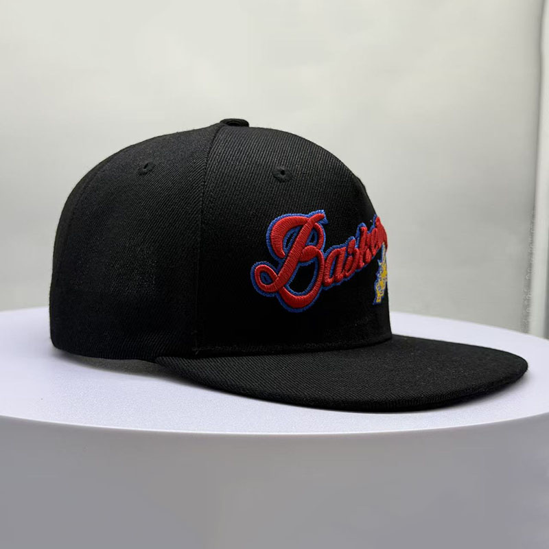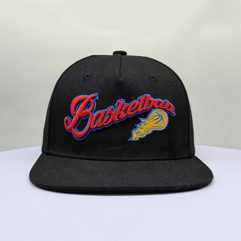 Style: flat brim 5 panel snapback cap Composition: 100% cotton Color: black Closure: double-row plastic snap Size: 58 cm |