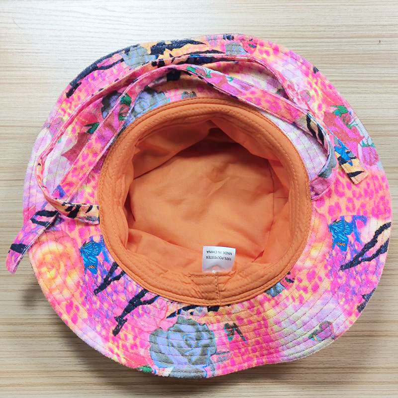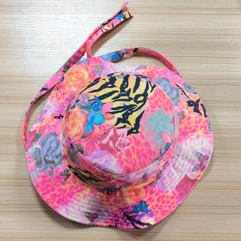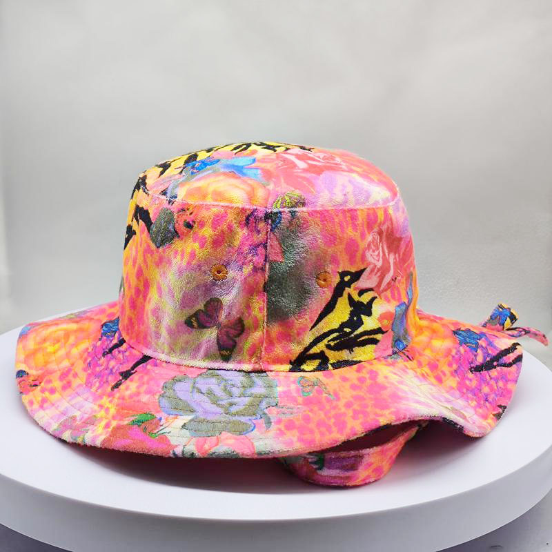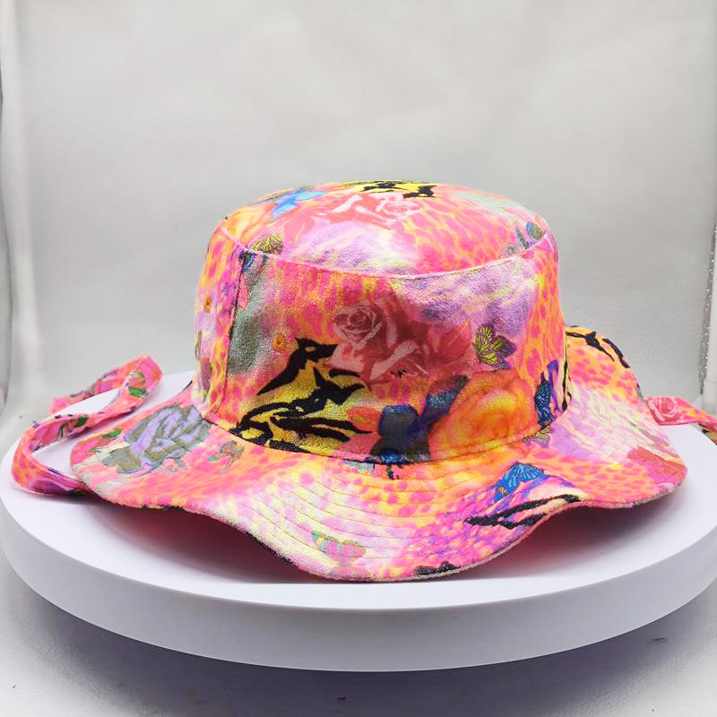 Style: red heat transfer printing bucket hat Composition: 100% terry cloth Techniques: heat transfer printing Color: red |