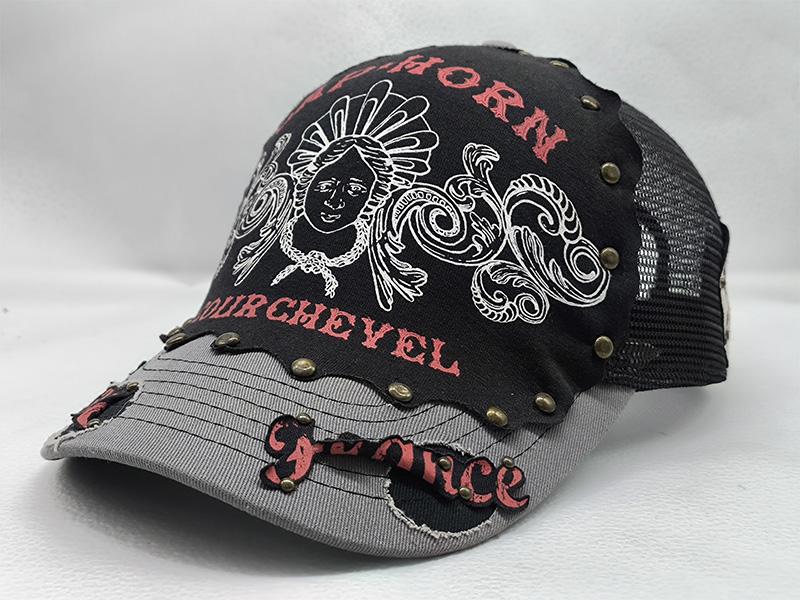 *Style: black curved brim 6 panel snapback trucker cap *Composition: 100% cotton front with 100% cotton brim *Mesh: breathable polyester mesh back and sides *Techniques: 3D embroidery and flat embroidery *Color: black *Closure: adjustable buckle *Size: one size |